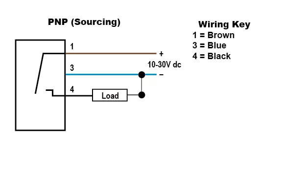 A PNP output source current to the load. This means that when the sensor is activated, it provides a positive voltage (+V) to the output line. PNP sensors are widely used in Europe, North America, and many modern automation systems because they are well-suited for use with PLC inputs designed to receive a positive switching signal.
